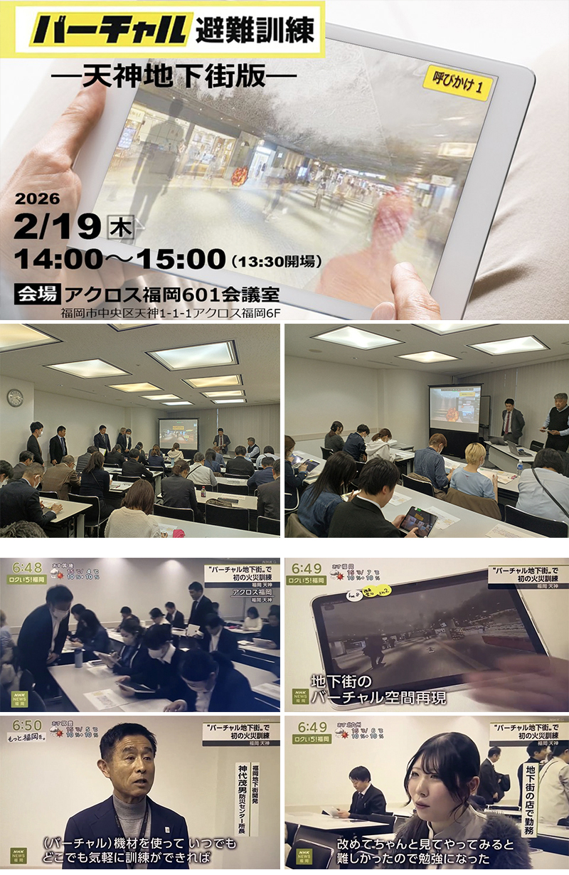 参加者90名(現地30名・リモート60名)、アクロス福岡の会議室で、バーチャル避難訓練-天神地下街版-を実施しました。